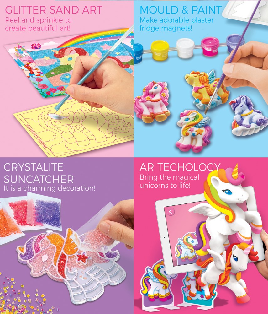 Step into a world of magic and creativity with this enchanting craft kit. Make six unicorn fridge magnets, two glitter sand art pieces, and a crystalline suncatcher. Then bring your creations to life with interactive AR technology for a truly magical experience.