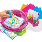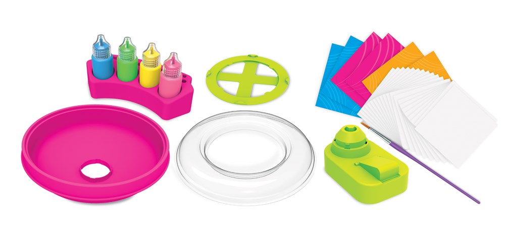 Create fancy patterns and colourful designs with this easy-to-use spin art machine. Just press to spin—no batteries required—then paint your own cards and artworks to mount on coloured cardboard. A fun and creative activity for young artists.