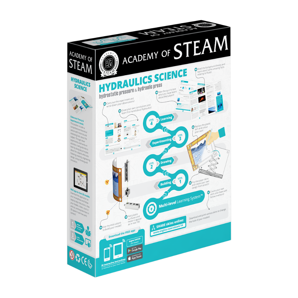 Packed with educational features, the Academy Of Steam Hydraulics Science lets your child learn about hydraulics and how construction and industrial machines lift heavy objects as they build their own hydraulic platform.