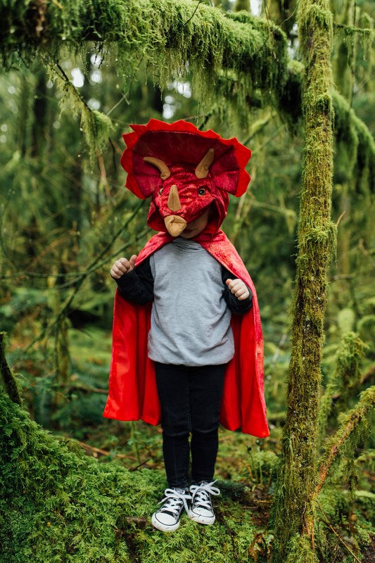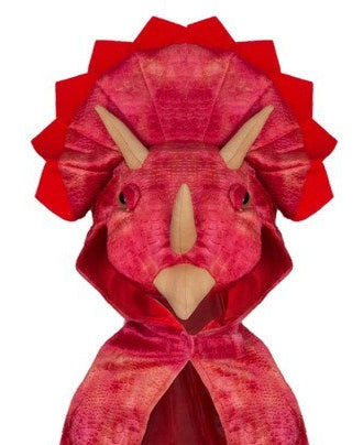 This dinosaur cape features textured velour fabric, realistic eyes, and 3D stuffed detailing on the hood. The design includes horns and felt detailing around the head, a lined hood and Velcro closure making this cape durable and ready for many wears.