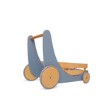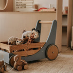 The walker's initial configuration places its wheels directly under the handle for added stability and includes a simple flat tray. Then, as a child's balance and confidence grow, the wagon's slat frame walls can be slotted into place allowing it to carry heavier and bulky items. Its wheels can also be relocated into a more classic wagon position.