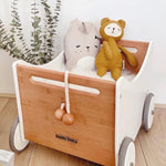 A stylish and eco-friendly toy storage box on wheels. Its clever design makes it easy to pull or push while gently sloping end panels and handles let you use it as a walker.
