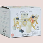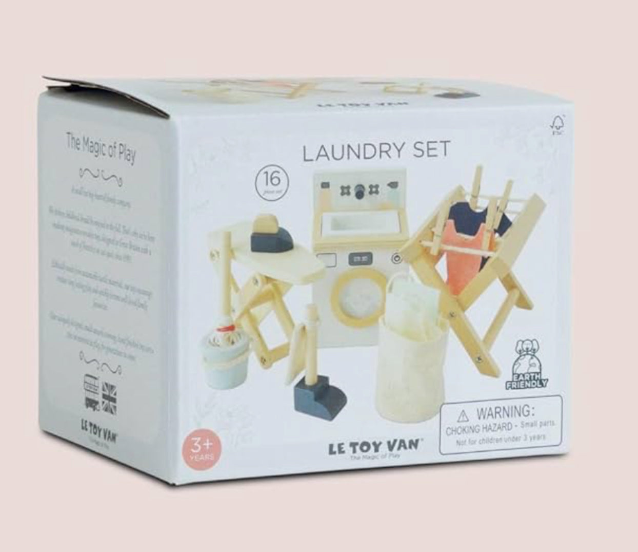 A wooden laundry set including washing machine, washing line, iron, ironing board and cleaning accessories.