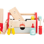 Comprehensive wooden tool kit box with 11 accessories for role play and skill development.