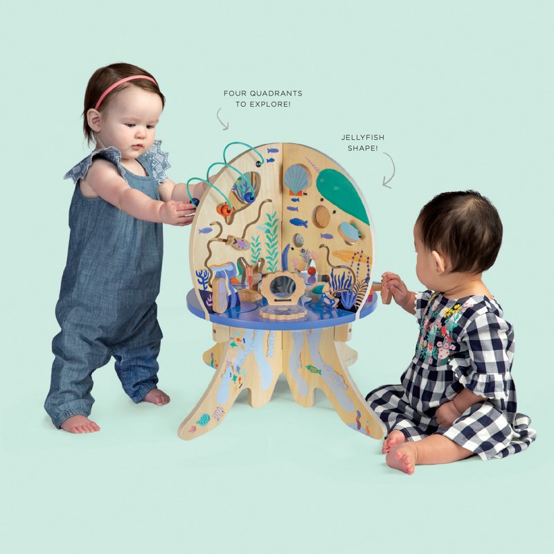 The design includes 4 quadrants in the shape of a jellyfish with a variety of activities for baby: gliders, bead runs, spinning gears, springy coral, clacking clams and peekaboo mirror.