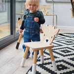 A very sweet wooden chair with black accents on the legs and an adorable deer character back.