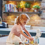 A playful wooden mixer with a metal swivel whisk, a wooden bowl, and a clacking on and off button for the bidding little chef.