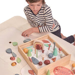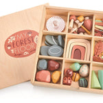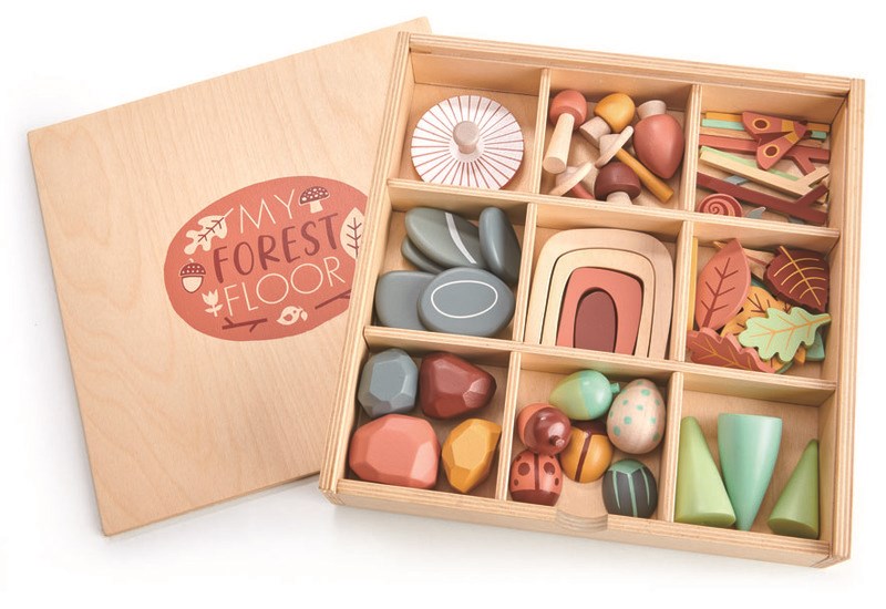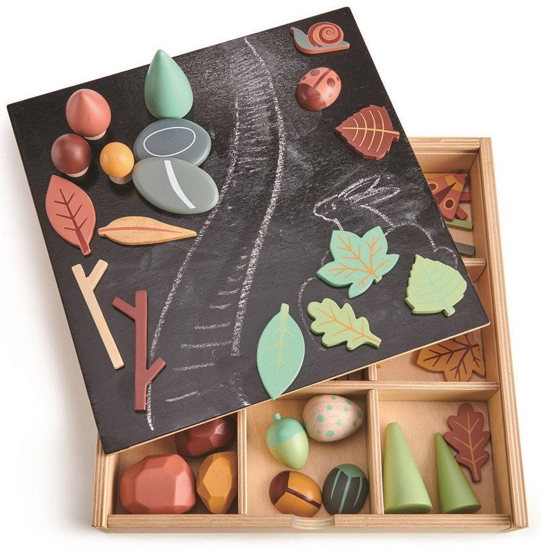 A stunning open-ended woodland forest tinker box. Children will adore using the 50 wooden pieces to create their own creative worlds. The set comes packaged in a well-designed storage box that features a chalkboard lid. The box sorting compartments can be removed and filled with sand to add a sensory play activity.